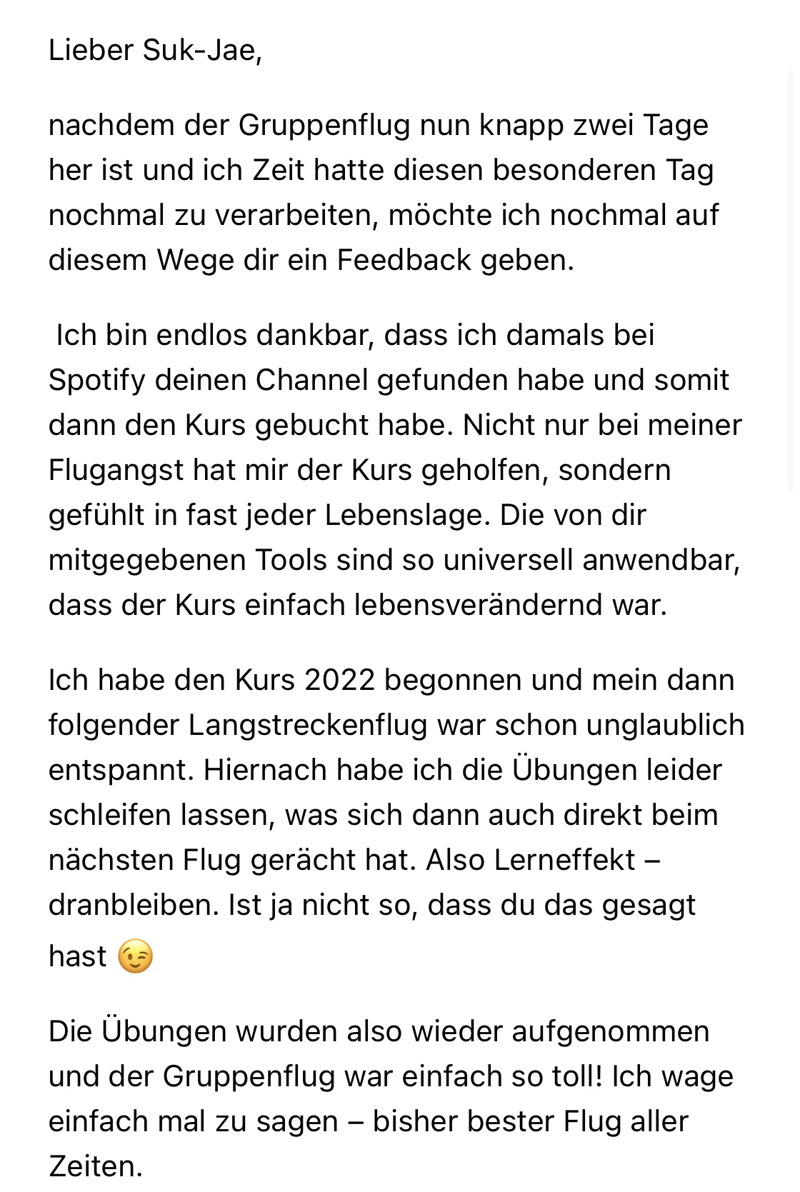 In der Vergangenheit gab es in regelmäßigen Abständen die Gruppenflüge für die erfolgreichen Absolventen des Flugangstseminars, um das Gelernte in die Praxis anzuwenden. Wir gehen dabei in einer gemeinsamen Gruppe eine kurze Strecke innerhalb von Deutschland fliegen (ich bin als Coach dabei). Egal ob Du live oder über die Aufzeichnung teilgenommen hast, Du kannst immer wieder mitkommen. Der Preis für den Flug ist nicht im Seminarpaket enthalten und wird separat abgerechnet (abhängig der tagesaktuellen Preise). Den Termin für den nächsten Flug geben wir noch bekannt.