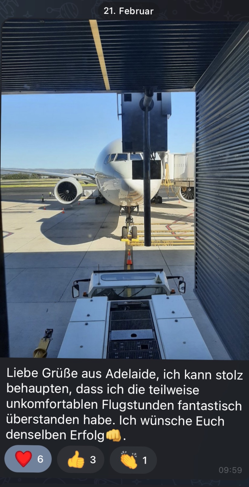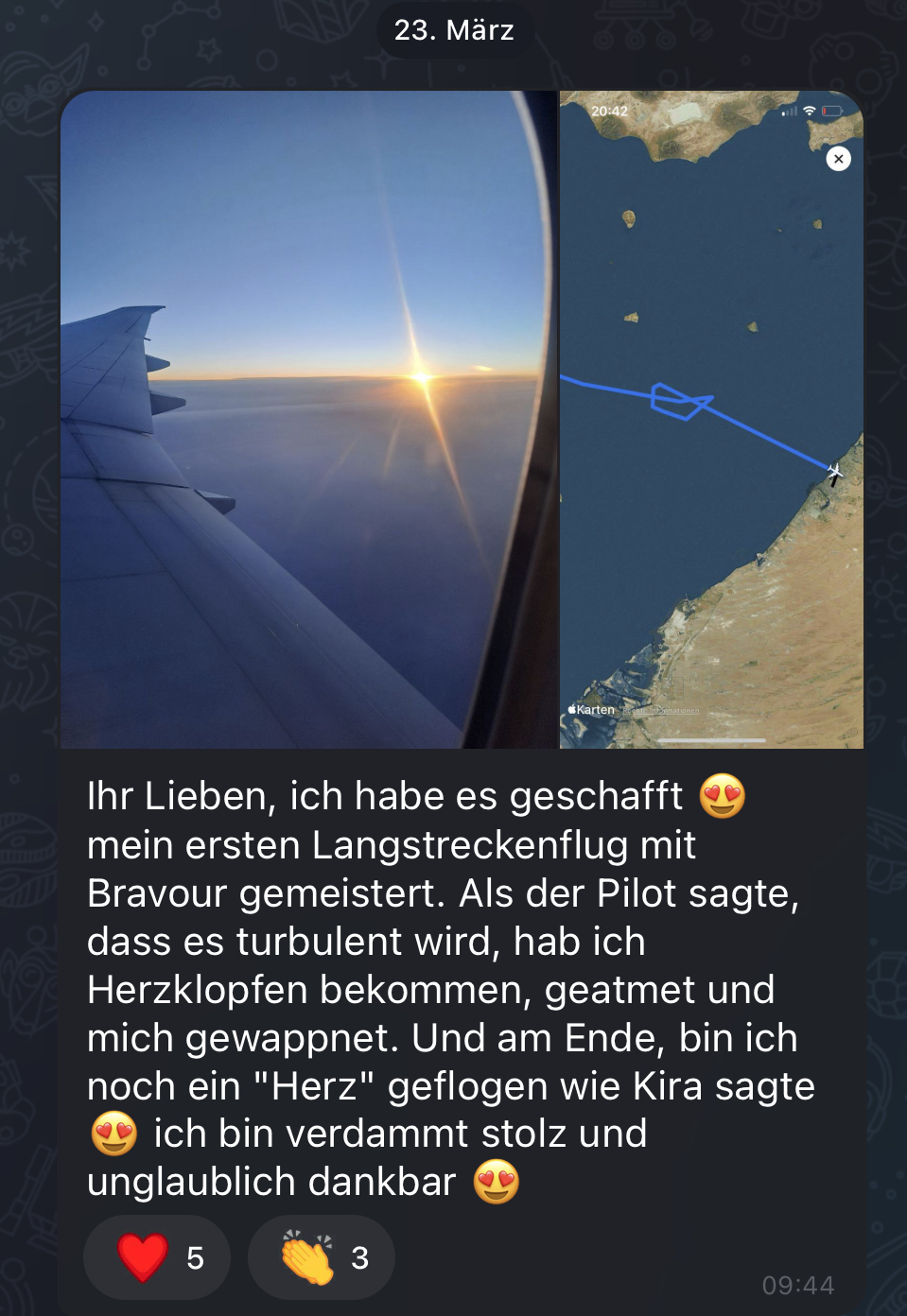 Roxi war eine Teilnehmerin des Seminars und ist danach das 1. Mal Langstrecke geflogen. Sie konnte sich dadurch einen Traum erfüllen und einen wundervollen Urlaub erleben.