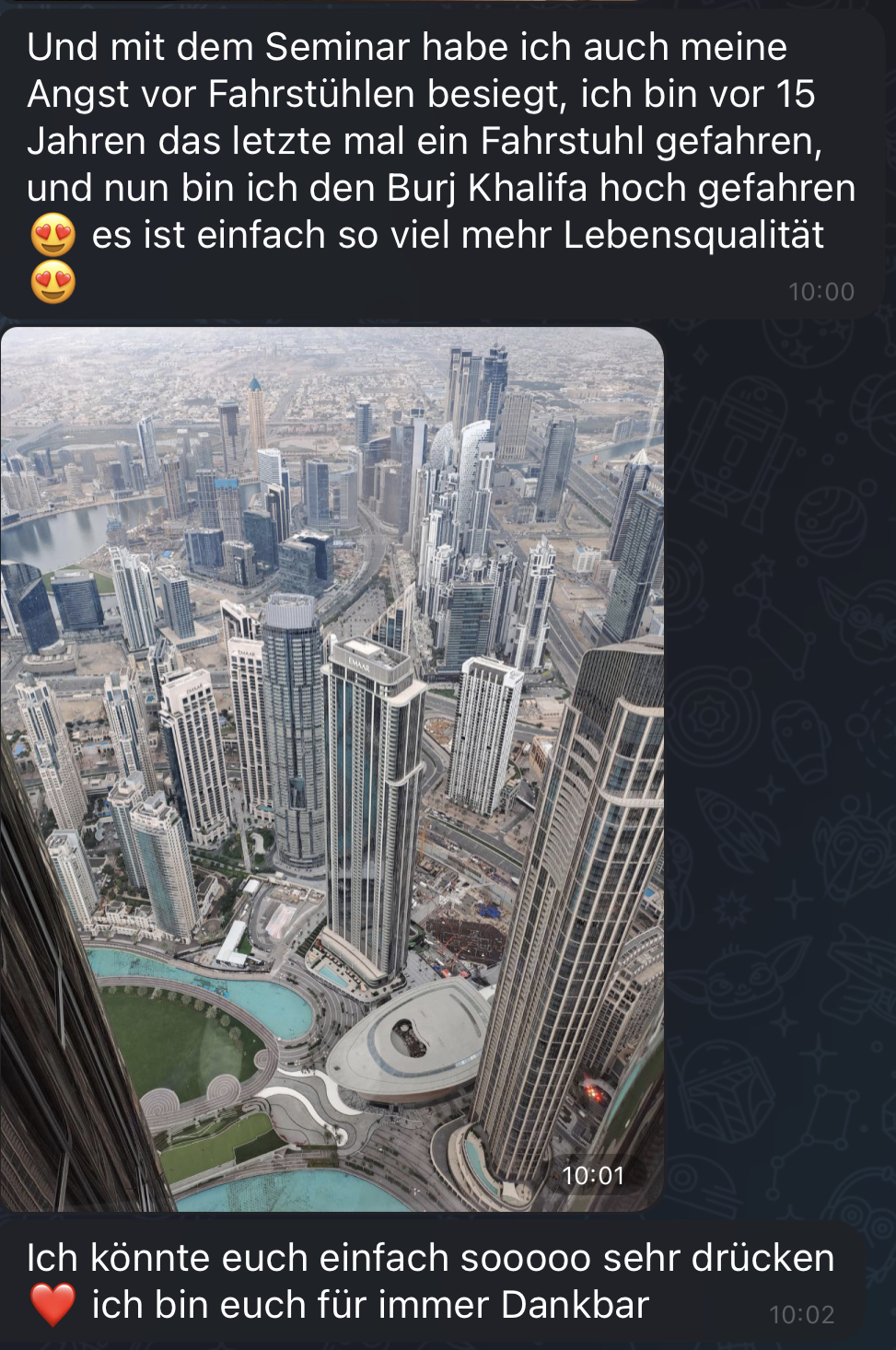 Ich weiß, dass die Tools aus dem Seminar funktionieren, weil ich sie selbst nutze und damit auch meine Höhenangst überwunden habe. Ich kann Dir alle Tools zeigen, aber anwenden musst Du sie selbst. Und dann sind echte Wunder möglich. Es haben schon viele vor dir teilgenommen und geschafft und fliegen jetzt um DIE WELT.