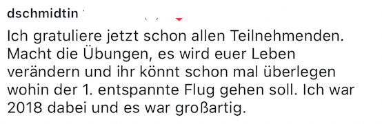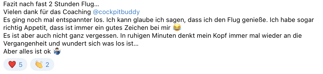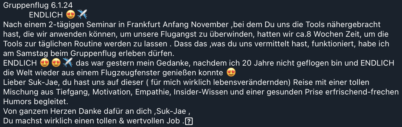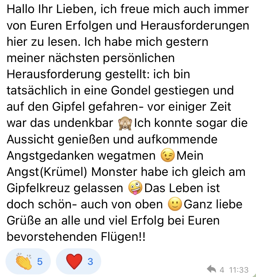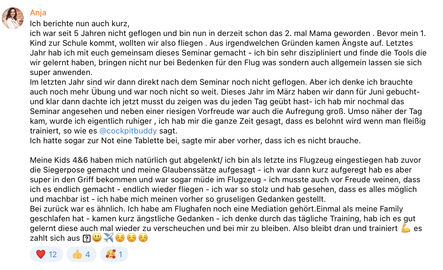 Ich weiß, dass die Tools aus dem Seminar funktionieren, weil ich sie selbst nutze und damit auch meine Höhenangst überwunden habe. Und ich weiß, dass es funktioniert, wenn Du sie anwendest und regelmäßig trainierst. Das sehe ich auch an den Teilnehmer:innen, die mir auch heute noch von ihren Flügen berichten.