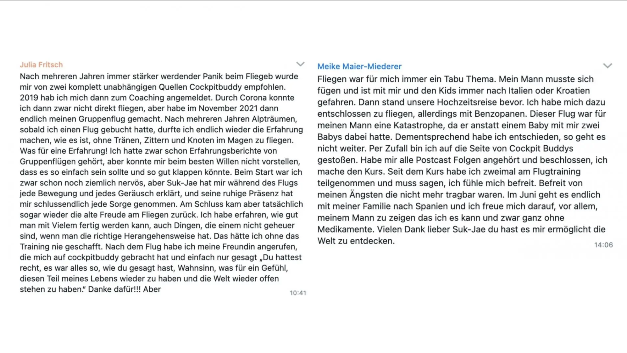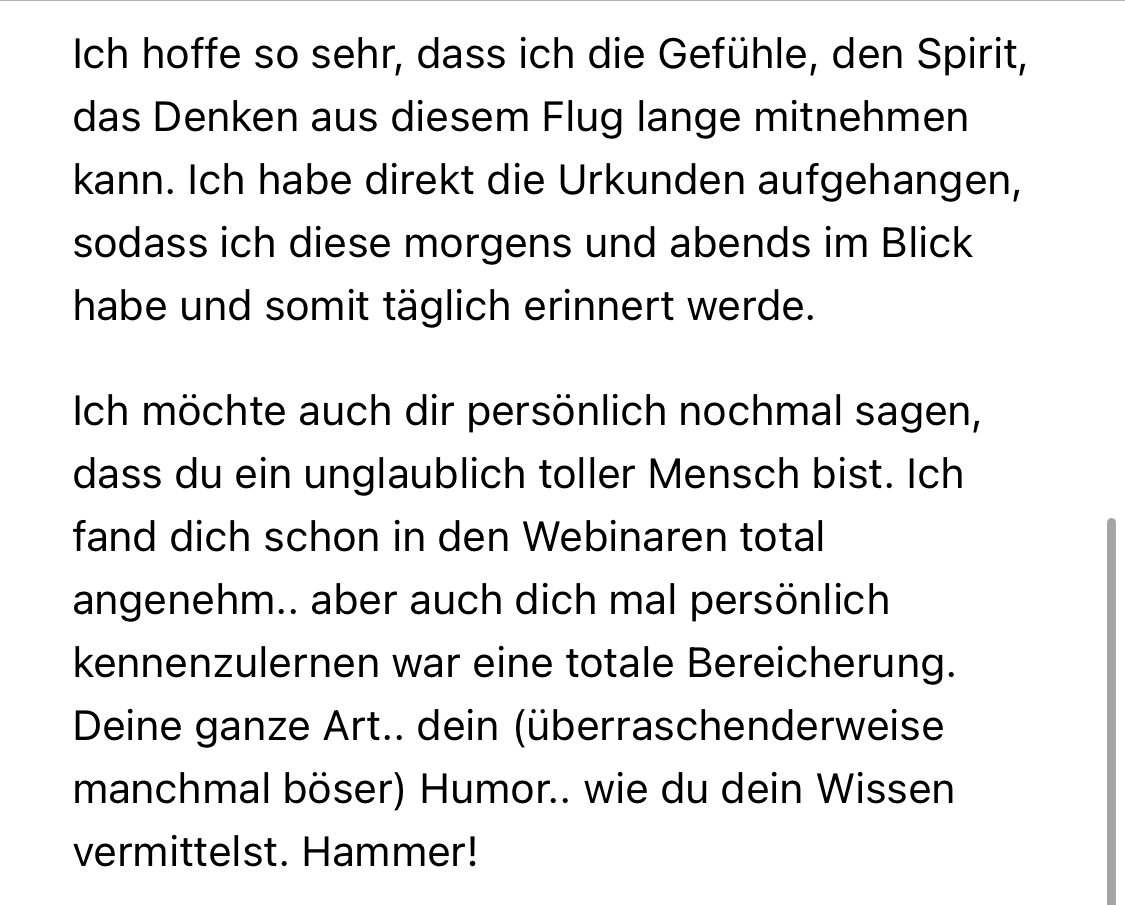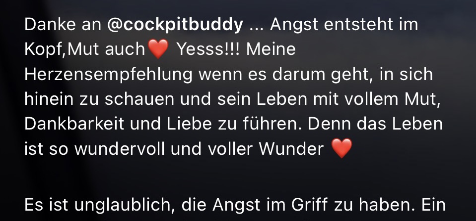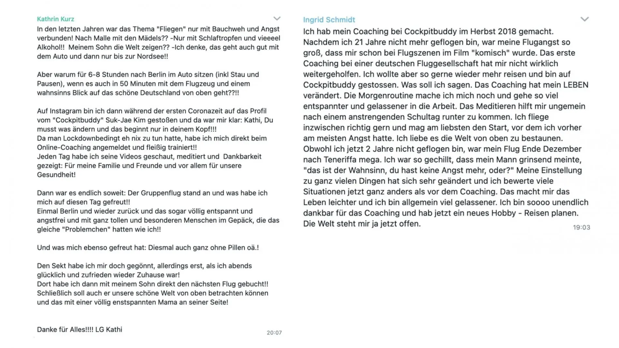 Ich weiß, dass die Tools aus dem Seminar funktionieren, weil ich sie selbst nutze und damit auch meine Höhenangst überwunden habe. Und ich weiß, dass es funktioniert, wenn Du sie anwendest und regelmäßig trainierst. Das sehe ich auch an den Teilnehmer:innen, die mir auch heute noch von ihren Flügen berichten.