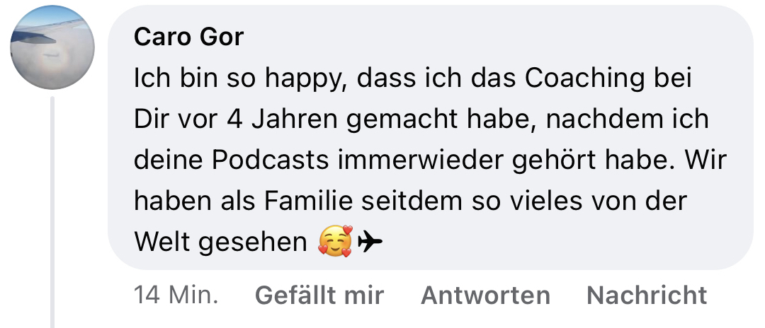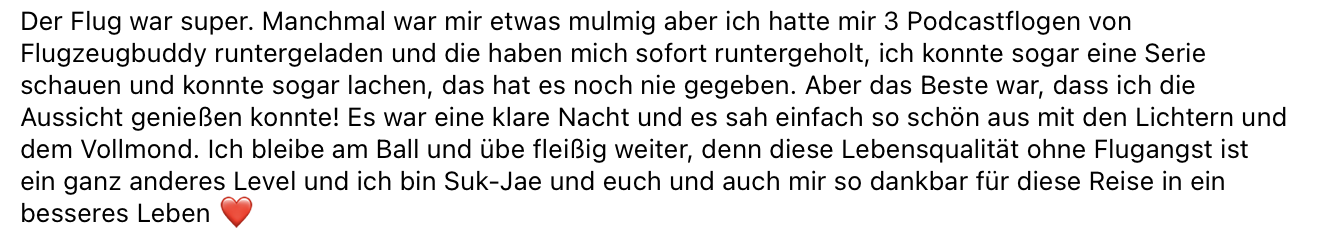 Und das ist die einzige langfristige Lösung gegen Flugangst. Es bedeutet, dass du weißt, wie du richtig auf deine Angstgedanken reagierst, anstatt dich von ihnen überwältigen zu lassen. Und dann sind wirkliche Wunder möglich und du kannst das Fliegen lieben lernen.