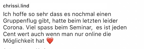 Falls Du an dem Termin nicht kannst, ist eventuell der Online Zugang etwas für Dich. D.h. Du bekommst den Zugang wie bei der Online Teilnahme und kannst Dir die Seminaraufzeichnung im Nachgang anschauen, bist aber Teil der Community und kannst ebenso an einem der nächsten Gruppenflüge teilnehmen.