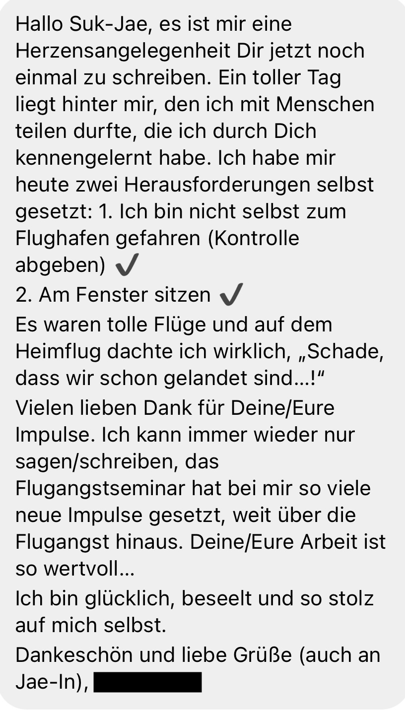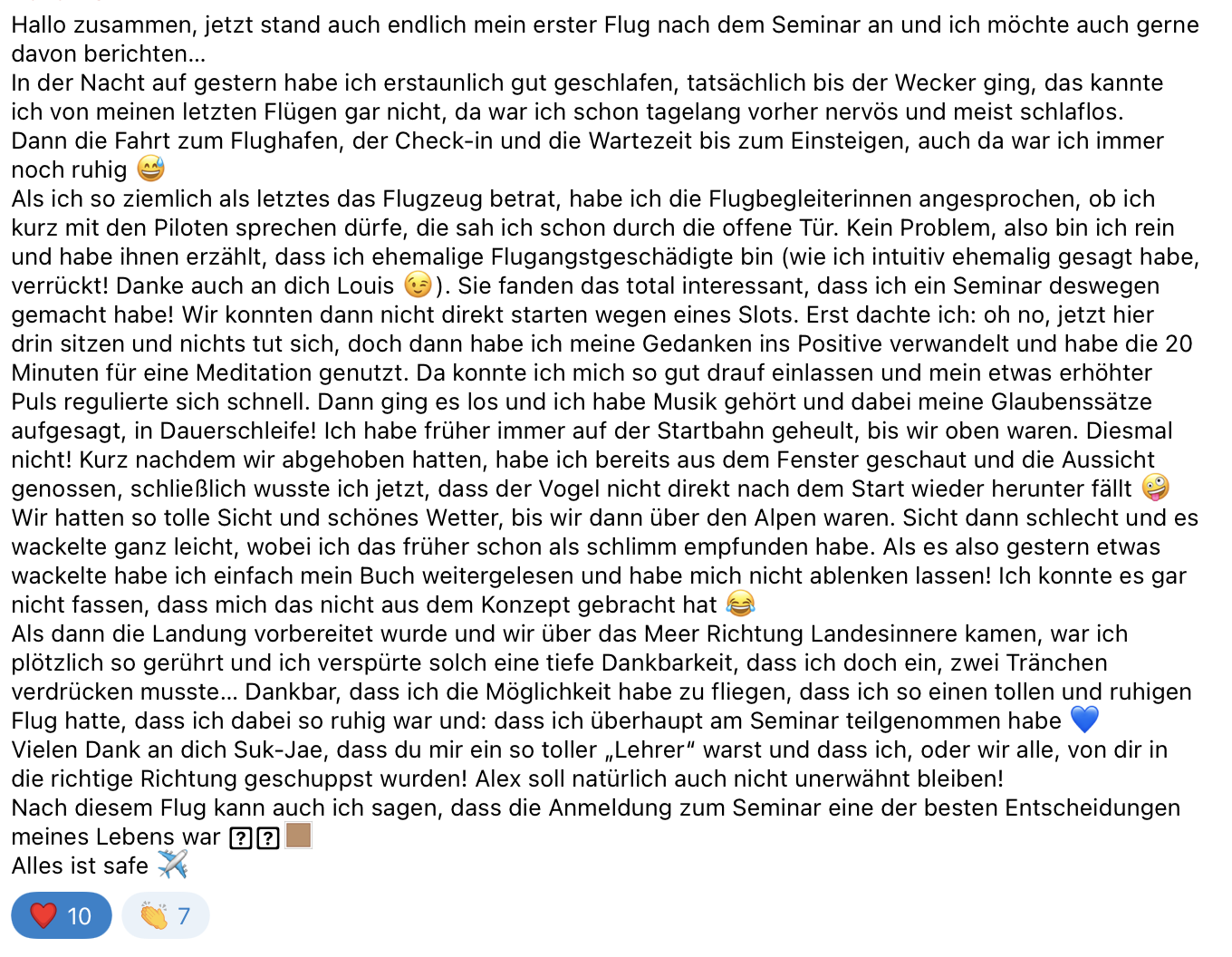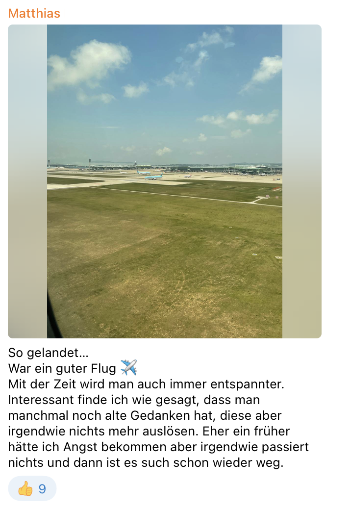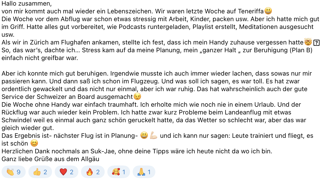 Eine Teilnehmerin ist nach dem Seminar endlich wieder in ein Flugzeug gestiegen ist und das nach 20 Jahren!