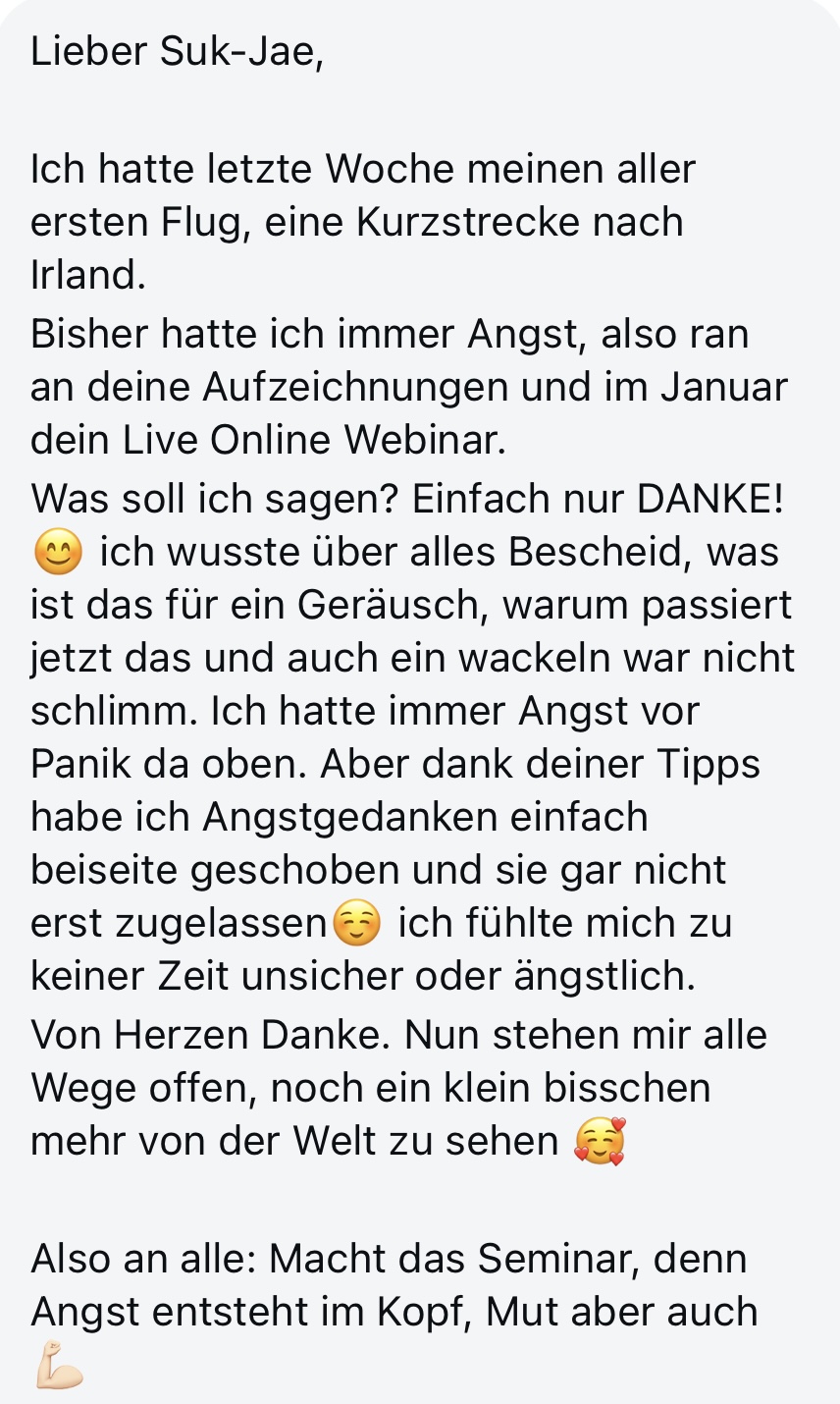 In meinem Live-Seminar lernst du Schritt für Schritt, wie du deine Flugangst verstehst, regulierst und langfristig Gelassenheit gewinnst. Konkret:
