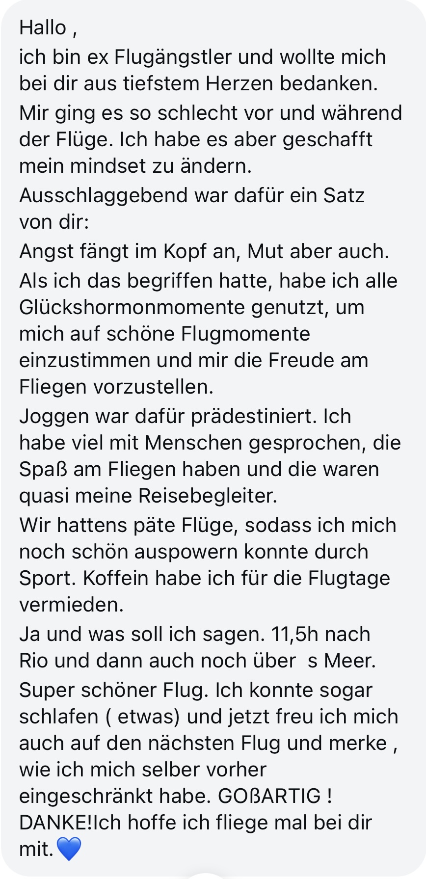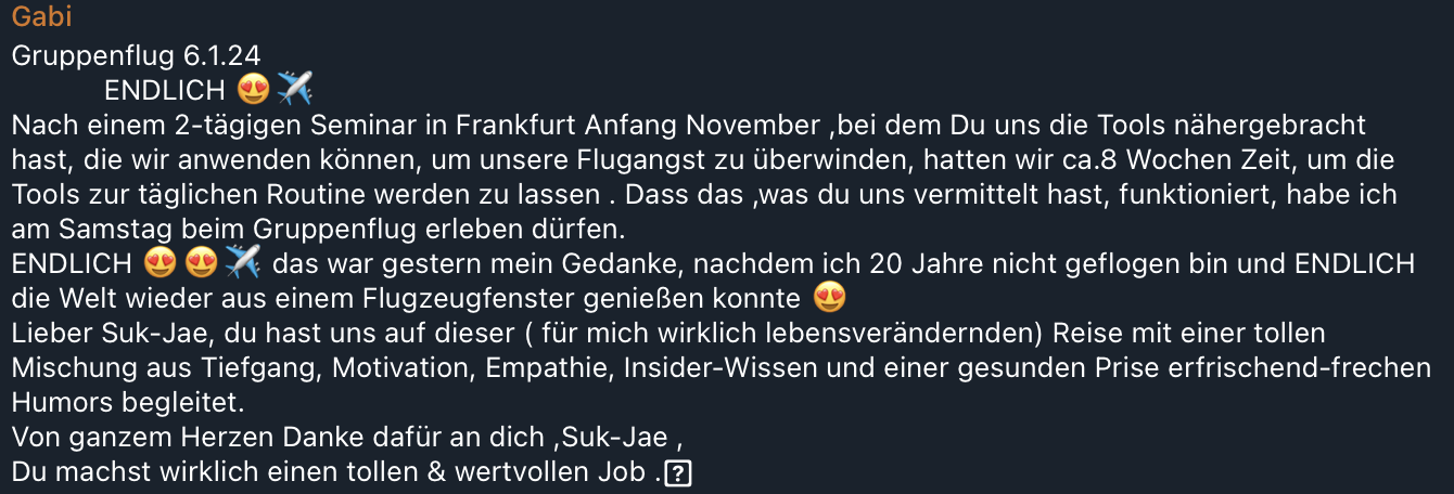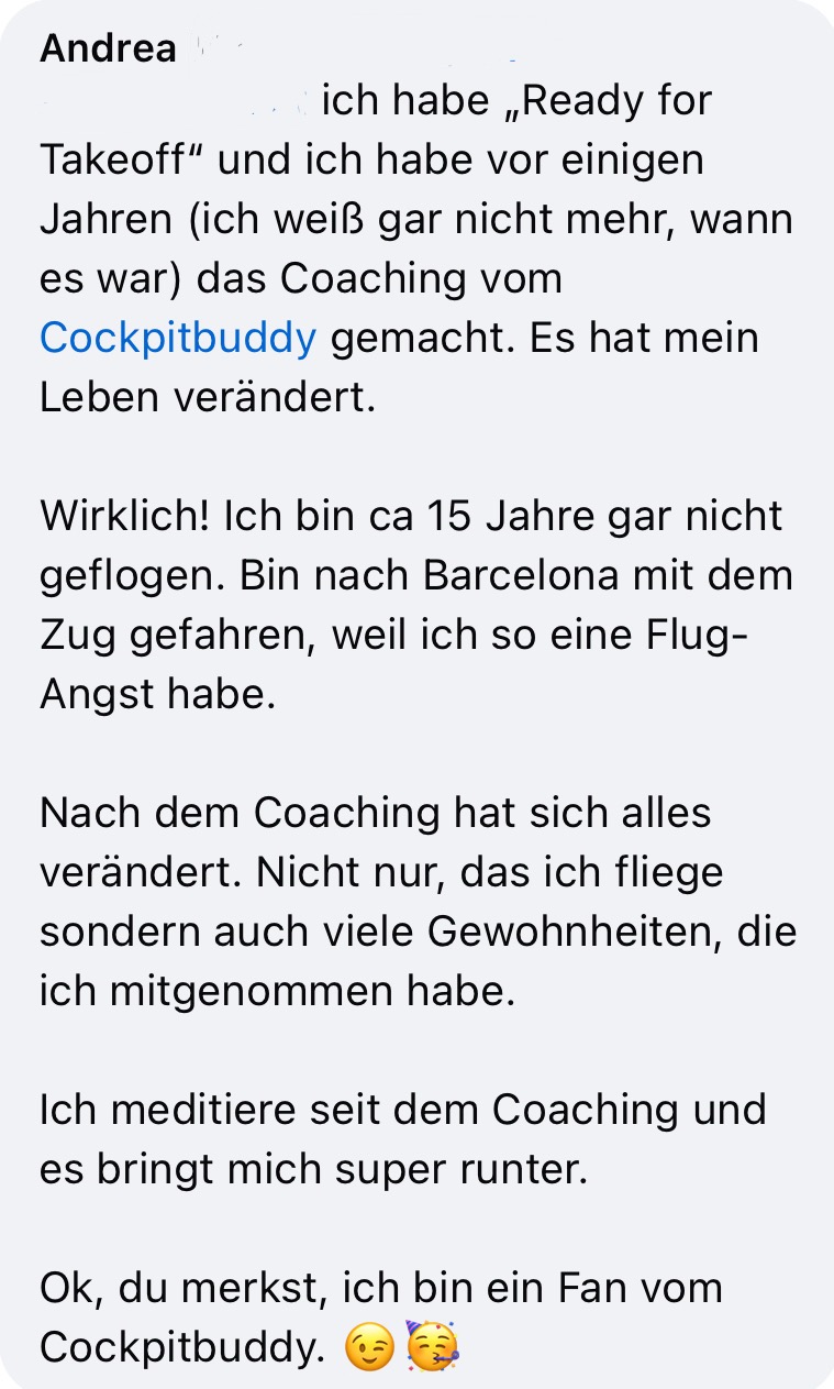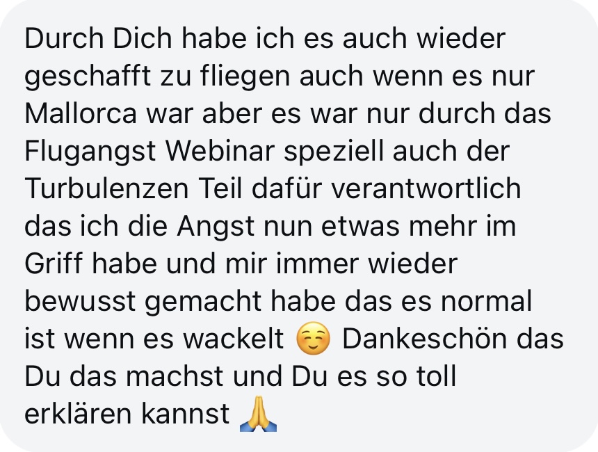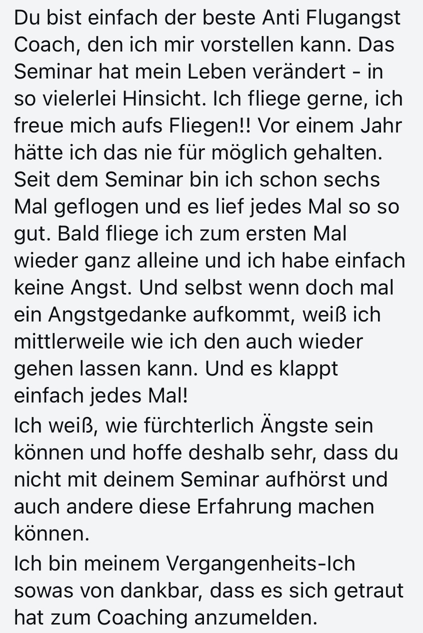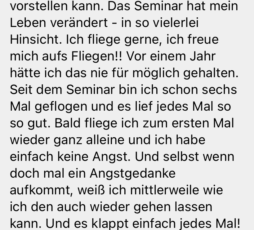 Es hat schon so vielen Menschen geholfen, selbst nach vielen Jahren ohne Fliegen wieder ruhig und selbstbewusst in ein Flugzeug zu steigen. Und genau deshalb weiß ich, dass es funktioniert.