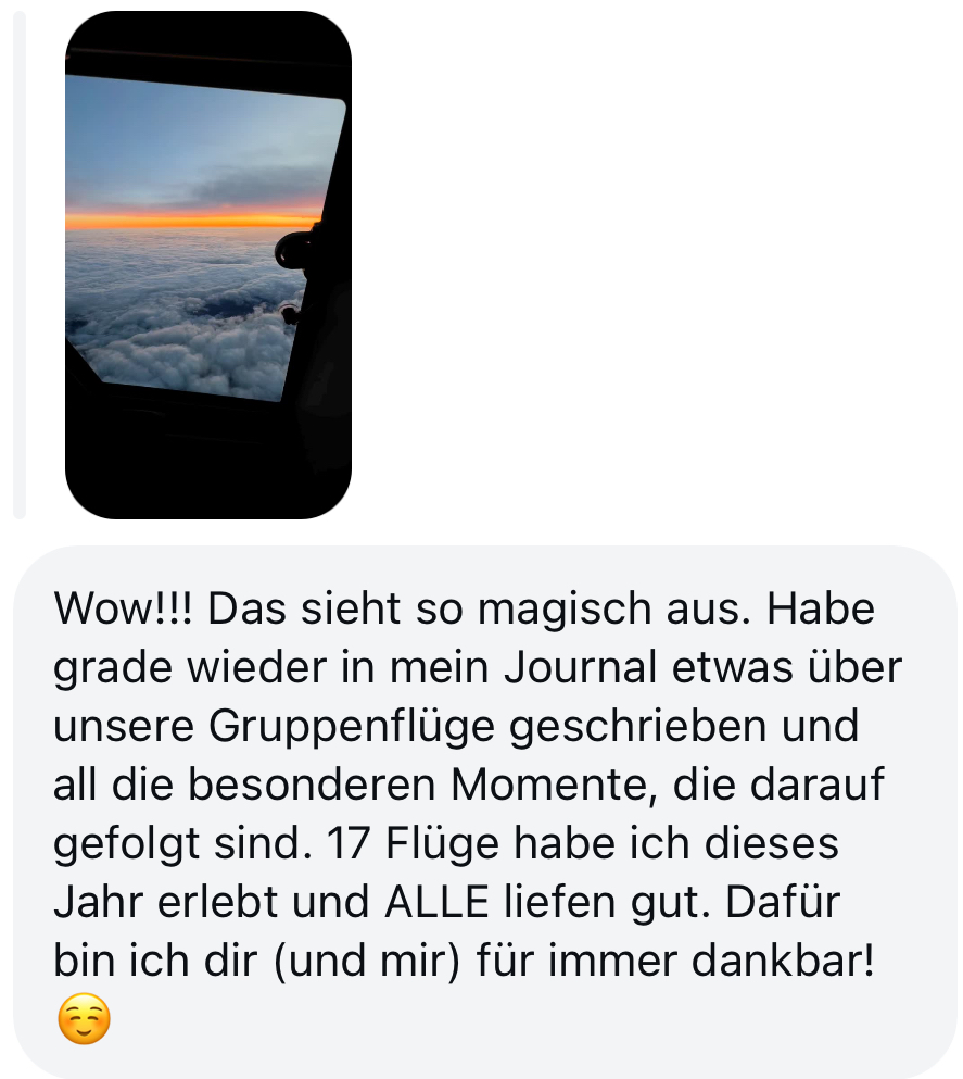Ein Flug mit Menschen, die die gleiche Reise machen wie du. Ein sicherer Raum, um das Gelernte zum ersten Mal im echten Flug umzusetzen: begleitet, verstanden und nicht allein.*
