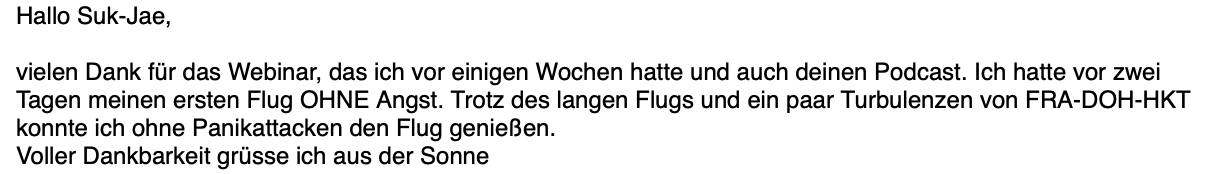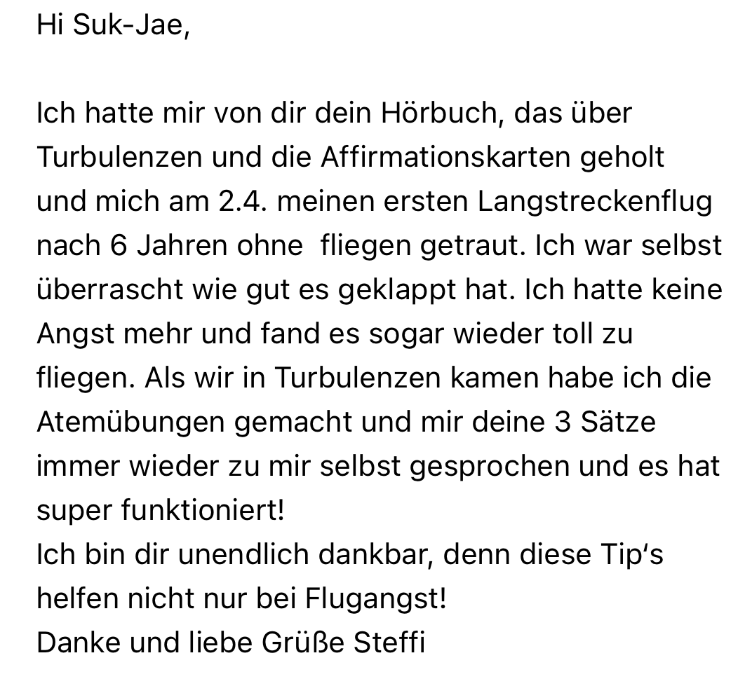 🎉 Du genießt Start und Landung wieder. Kein Wegdrehen, kein Festklammern. Du schaust aus dem Fenster und fühlst dich sicher.