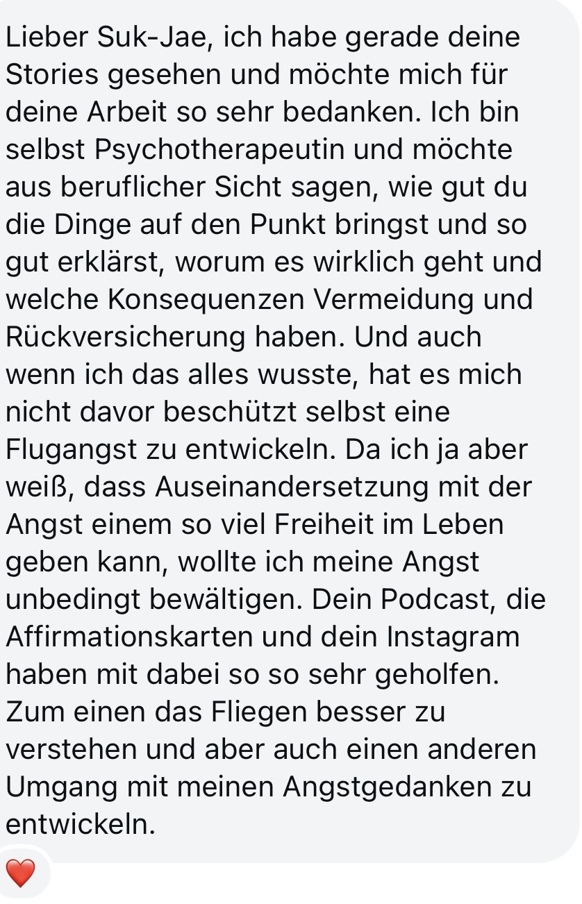 Du kannst mir jede Frage stellen – egal, ob du gerade mit Gedankenspiralen kämpfst, vor einem Flug Angst bekommst oder ein bestimmter Moment dich stresst.